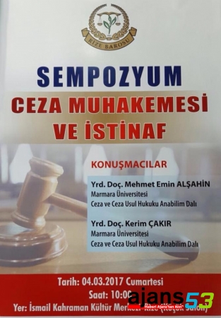 Rize Baro Başkanlığı’ndan yapılan yazılı açıklamada ‘Ceza Muhakemesi ve İstinaf’ konulu Sempozyumun 4 Mart Cumartesi günü saat 10:00’da İsmail Kahraman Kültür Merkezi küçük salonda gerçekleştirileceği belirtildi.