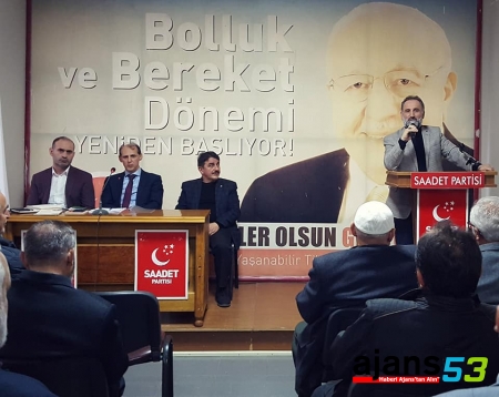 Toplantıya misafir olarak katılan Saadet Partisi Genel İdare Kurulu Üyesi ve Eski Araklı Belediye Başkanı Ümit Çebi, “Biz buraya neden geldik? Şu an, bir Pazar günü, şu salon dolu, bir yandaki salonu da hanım kardeşlerimiz doldurmuş, arka tarafta gençlerimiz ayakta bizi dinliyor. Neden? Çünkü yeryüzüne ve Türkiye’ye adil düzeni; biz çalışsak da çalışmasak da, Ebrehe’nin ordusunu kuşlarla yıkan Allah kuracaktır. O dönemin Amerika’sı gibi topu tüfeğiyle geldiğini düşünün, Allah bu orduyu kuşlarla mağlup etmiştir. Tıpkı en sevdiği Resulünü, zayıf bir örümcek ağı ve narin bir güvercinle kurtardığı gibi. O yüce Allah ki, kendisine külhanbeyliği yapan Nemrud’u topal bir sinekle mağlup etmiştir. Bu olaylarda büyük bir mesaj vardır. Allah diyor ki ey kulum sakın ümitsiz olma, eğer bana iman etmişsen bu örnekleri gözünün önüne al benim nasıl bir Allah olduğumu bil. Ey kullarım sakın Amerika’nın gücünden korkmayın. Topuyla yakıyor ortadoğu’yu, roketiyle ateşe çeviriyor ortalığı demeyin, ey kullarım siz adam olun ben o ateşi gül bahçesine çeviren Allah’ım. Ey kullarım Amerika ne ki, siz beni tanıyın benim davamda, benim rızam için mücadele edin diyor. İşte bugün burada toplanmamızın nedeni o Allah rızası için çalışma şevkimizdir.” dedi.