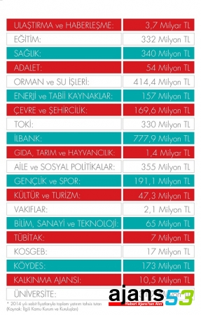 Yatırımların rakamsal olarak ifade edildiği açıklamada, “Ulaştırma ve Haberleşmede 3,7 milyar TL, Eğitimde 332 milyon TL, sağlıkta 340 milyon TL, adalette 54 milyon TL, orman ve su işlerinde 414,4 milyon TL, enerji ve tabii kaynaklarda 157 milyon TL, çevre ve şehircilikte 169,6 milyon TL, TOKİ’de 330 milyon TL, İLBANK’ta 777,9 milyon TL, gıda tarım ve hayvancılıkta 1,4 milyar TL, aile ve sosyal politikalarda 355 milyon TL, gençlik ve sporda 191,1 milyon TL, kültür ve turizmde 47,3 milyon TL, Vakıflarda 2,1 milyon TL, bilim, sanayi ve teknolojide 65 milyon TL, TÜBİTAK’ta 7 milyon TL, KOSGEB’de 17 milyon TL, KÖYDES’te 173 milyon TL, Kalkınma Ajansı’nda 10,5 milyon TL, Üniversite’de 231,7 milyon TL” yatırım yapıldığı belirtildi.