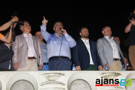 Toplanan kalabalık sloganlar atarak darbe girişimlerini protesto etti. Meydana getirilen anons aracının üzerine çıkarak kalabalığa yönelik açıklama yapan AK Parti Rize Milletvekili Hasan Karal, “Türkiye’nin seçilmiş lideri Recep Tayyip Erdoğan’ın memleketi Rize’den tüm dünyaya selam olsun. Demokrasi için, Milli irade için, bu milletin adam yerine konulabilmesi uğruna keyfini yatağını bırakan siz değerli hemşehrilerimin önünde saygıyla eğiliyorum. Vatanınıza, milletinize, milli iradenize, şerefinize, haysiyetinize sahip çıktınız. Allah’ın izniyle bizler, sizler, hepiniz beyaz kefen giymiş vatan çocukları olarak, kanımızın son damlasına kadar bu ülkenin demokrasisini, milli iradesini korumaya azimliyiz” dedi.