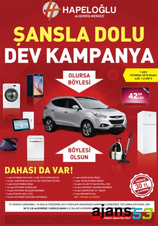 Mayıs ayında alışveriş yapan müşterileri arasında yapılan çekilişle 3 kişiyi Hyundai i20 sahibi yapan Hapeloğlu Avm, 2015 yılına 101 hediye ile damgasını vurmaya hazırlanıyor. Hapeloğlu Alışveriş Merkezi Yönetim Kurulu Başkanı Recep Ali Hapeloğlu, önceki hafta 101 hediye ile Şansla dolu dev kampanyayı başlattıklarını belirterek, müşterilerine 10 Aralık 2015 tarihine kadar her 30 Tl'lik Alışverişe 1 çekiliş hakkı ile onlarca birbirinden değerli hediye kazanma şansı vereceklerini söyledi.