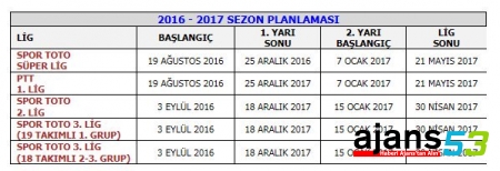 2016-2017 Sezonu PTT 1. Lig'de 19 Ağustos'ta, Spor Toto 2. ve Spor Toto 3. Lig'de ise 3 Eylül'de oynanacak karşılaşmalarla başlayacak.