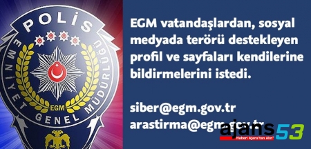 Emniyet Genel Müdürlüğü, vatandaşlardan, sosyal medya üzerinden terörfaaliyetlerini destekleyen ve suç unsurları içeren profil ve sayfaları kendilerine bildirmelerini istedi.