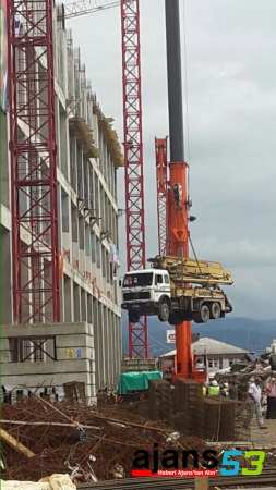 RİZE'nin İyidere İlçesi'nde, yapımı süren ÇAYKUR çay paketleme fabrikası inşaatı sırasında pompası üst katlara ulaşamayan beton mikseri vinçle 40 metre yüksekteki 3'üncü kata çıkarıldı.