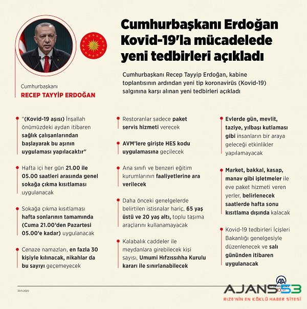 Cumhurbaşkanı Erdoğan, Hafta içi hergün 21.00 - 05.00 saatleri arasında, haftasonları ise Cuma 21.00 pazartesi sabahı 05.00 a Kadar genel sokağa çıkma yasağı uygulanacak. Düğün ve cenazelere en fazla 30 kişi katılabilecek.