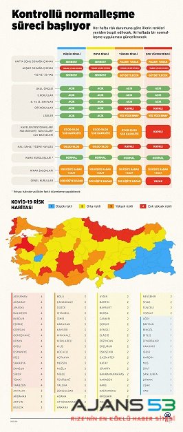Bu değerlendirme ile 81 şehir düşük riskli mavi, orta riskli sarı, yüksek riskli turuncu ve çok yüksek riskli kırmızı olarak renkleri ayrıldı. Her hafta risk durumuna göre iller renkleri yeniden tespit edilecek. Ayrıca her iki haftada bir de normalleşme uygulaması güncellenecek.