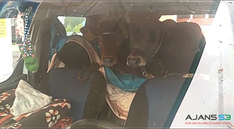 Rize'nin Ardeşen ilçesinde yaşayan vatandaşın, iki danasını arka koltuğunu yatırarak yerleştirdiği otomobilinde yaylaya çıkarması dikkati çekti.